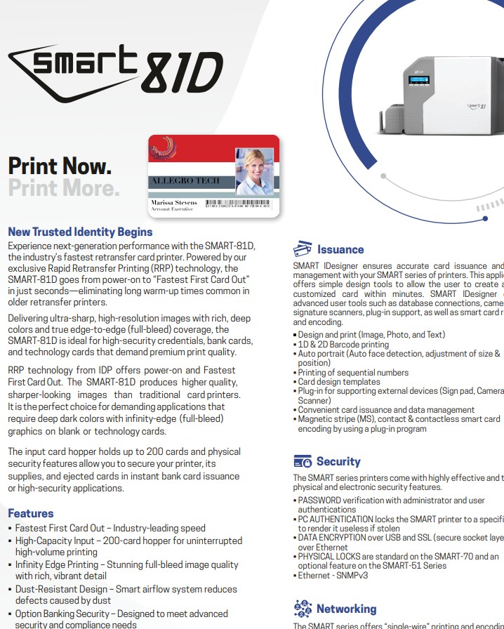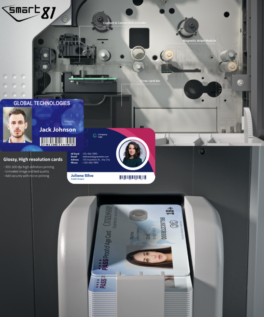 The SMART-81 allows you to produce durable, photo-quality ID cards with consistent edge-to-edge results—ideal for corporate credentials, access control badges, and smart card applications.